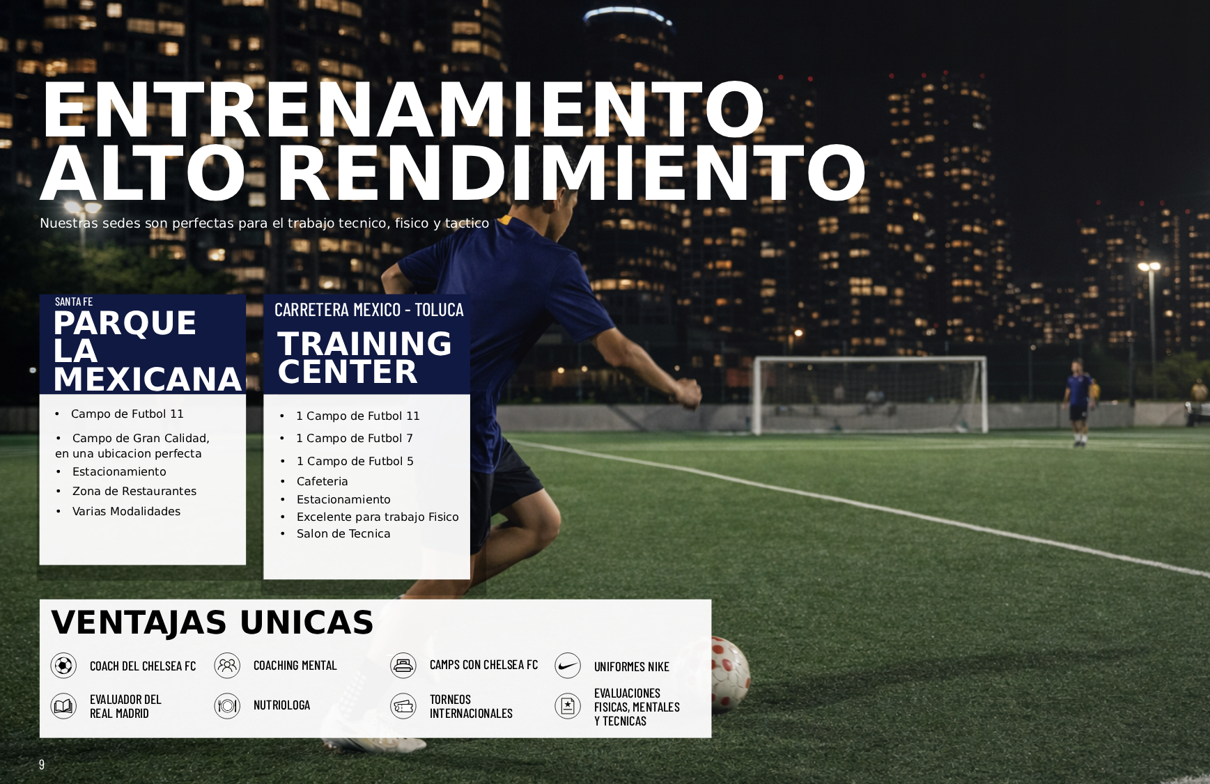 Nuestras sedes —Parque La Mexicana en Santa Fe y nuestro Training Center sobre Carretera México-Toluca— están seleccionadas estratégicamente para potenciar el desarrollo técnico, físico y táctico de cada jugador.